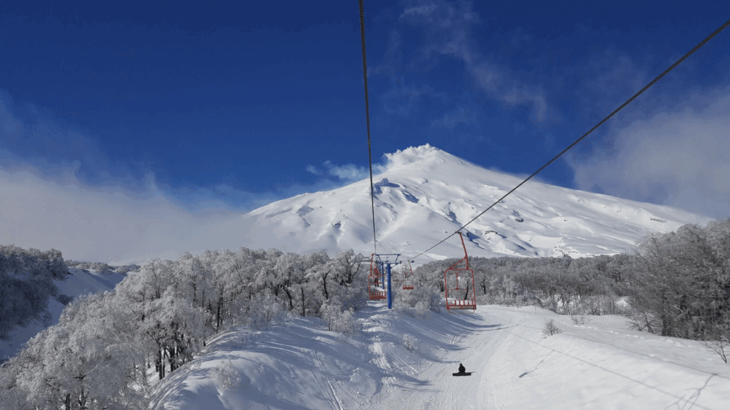 Subida do teleférico para a estação de esqui de Pucón no Vulcão Villarrica, com paisagem nevada e céu limpo de inverno.